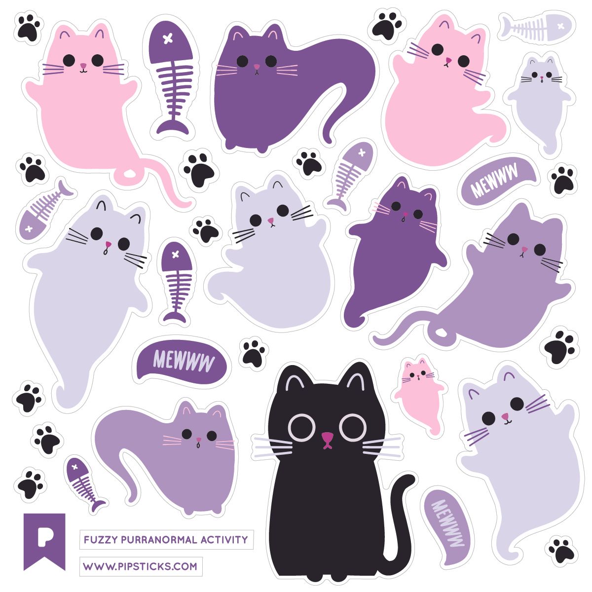 Includes one 4" x 4" sheet of Fuzzy Purranormal Activity PipStickers and includes the Pipsticks manifesto.