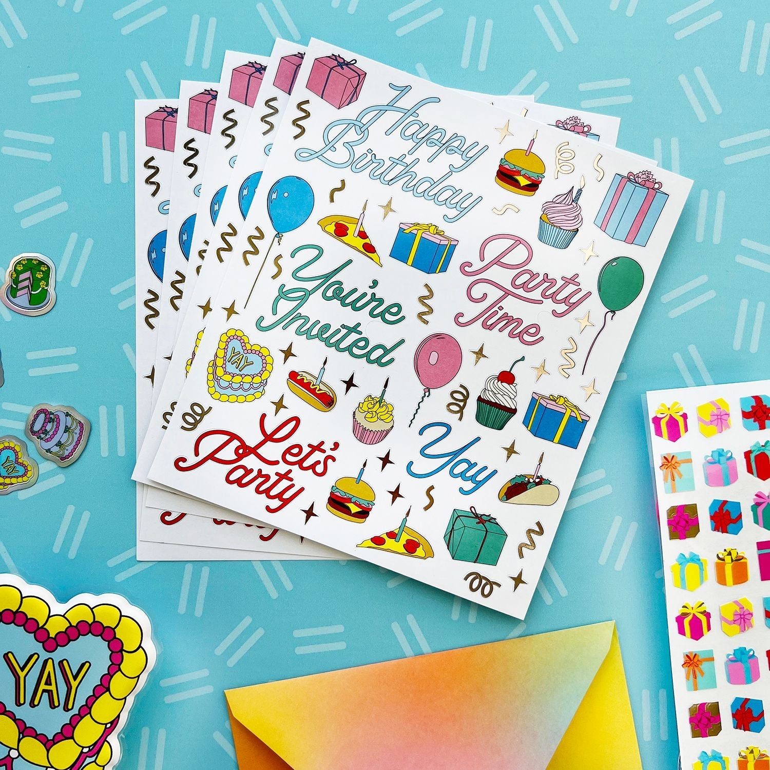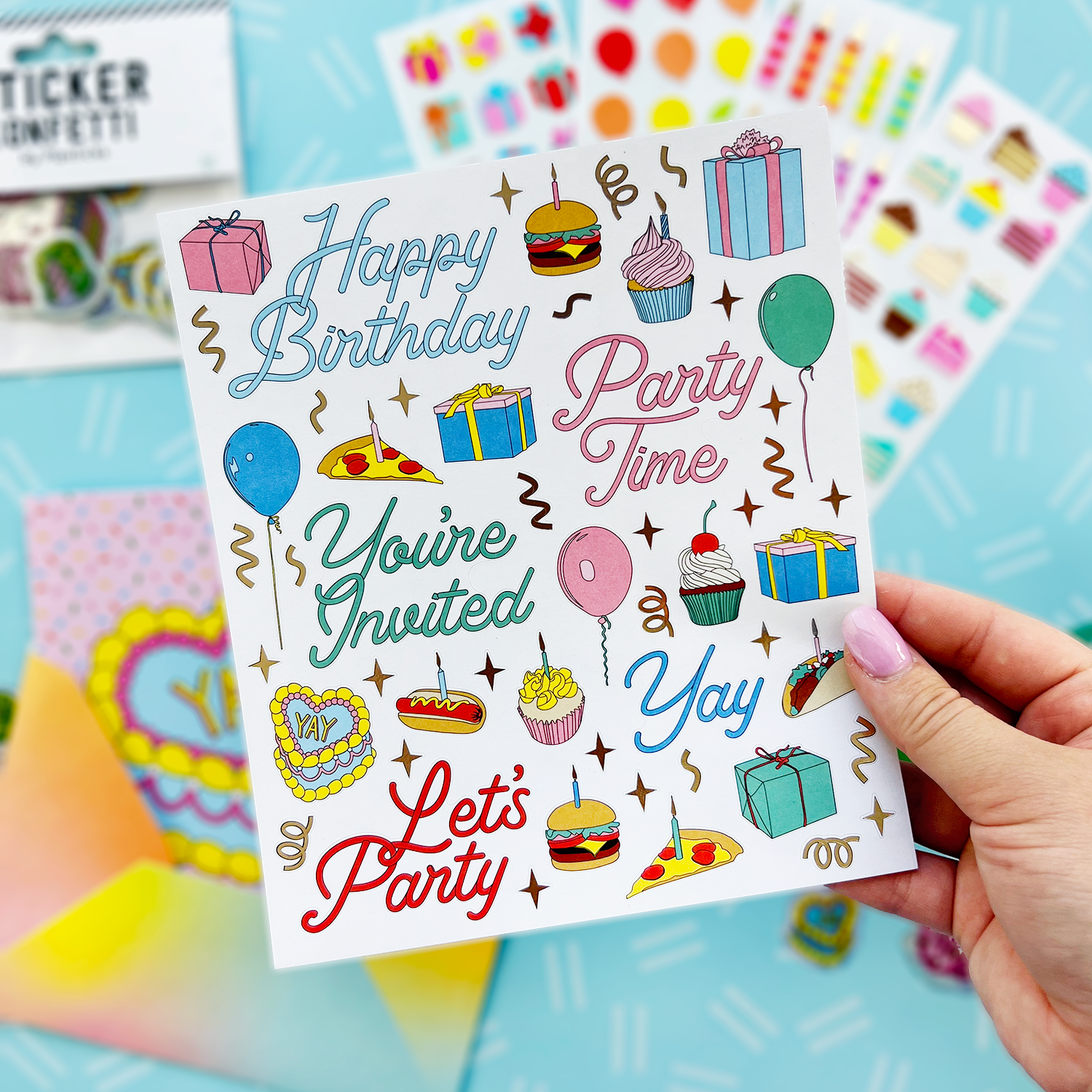 Includes five (that's right, FIVE!) 6" x 7" sheets of Get The Party Started Labels PipStickers.