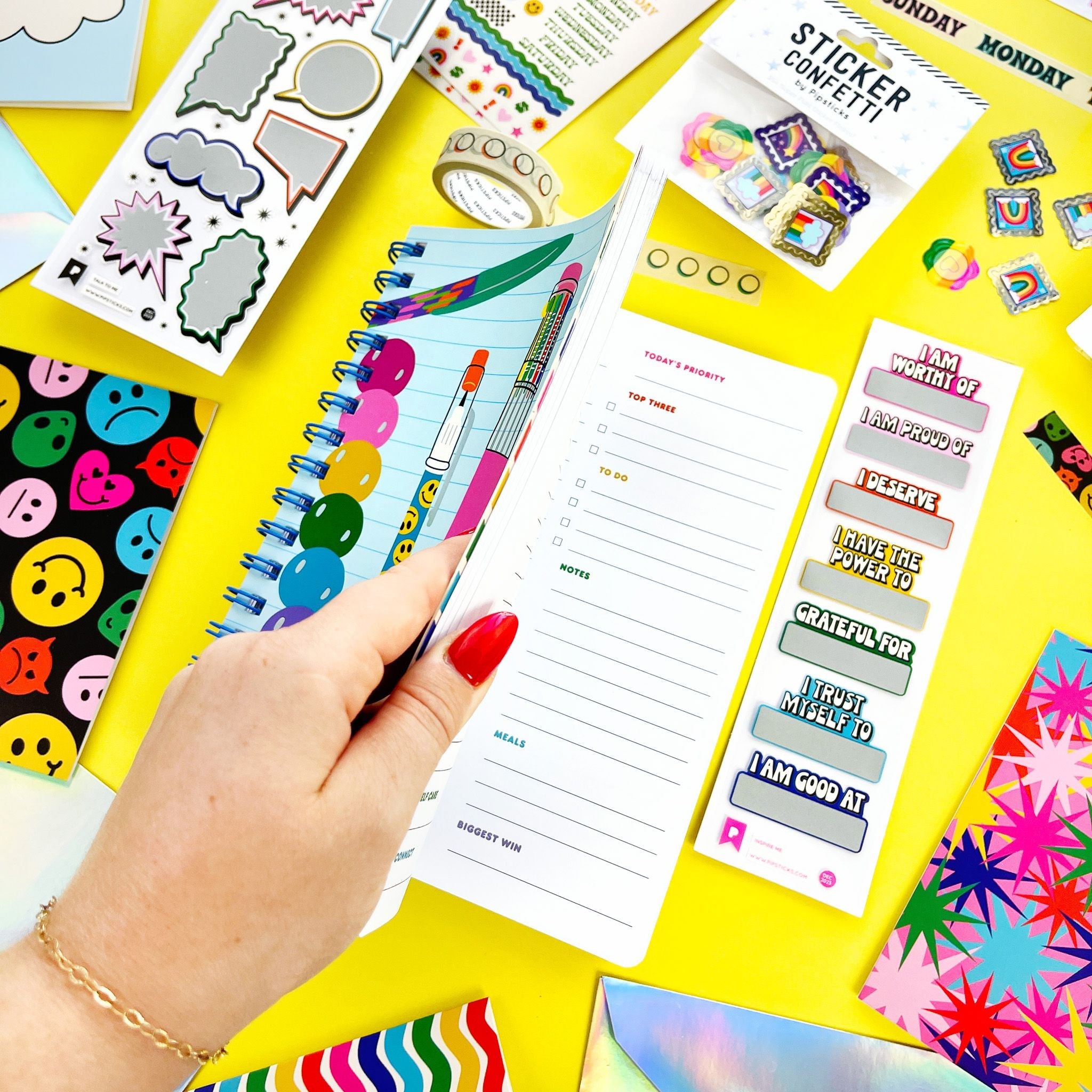 Elevate your planning game with this charming daily planner that combines functionality with flair, making it a must-have for anyone seeking to add a touch of whimsy to their daily routine. Each page features colorful designated sections for your schedule, priorities, to-do lists, notes, meals, self-care and more. Includes a pocket to store receipts, business cards, or any other essentials you need to keep close at hand. The Make Your Mark Daily Planner will ensure that you have everything you need to navigate your day effectively. Get ready to seize each day in style!